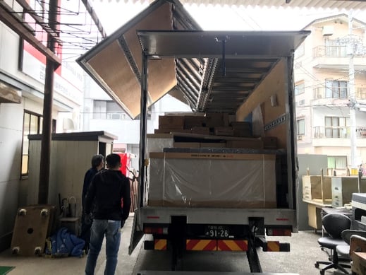 新しい事務機器が運ばれてきました。今回の事務所改装では机やロッカーなど、すべてを新調しました。実はここが一番お金のかかったところです。搬入と組み立てはアグサスさんの手配でプロにやっていただきます。